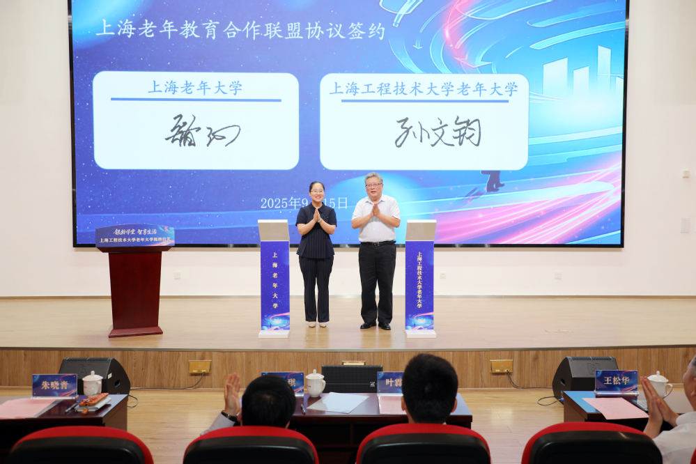 上海老年大学副校长褚沁与党委离退休工作部部长、老年大学副校长孙文钧签署上海老年大学与上海工程技术大学老年大学合作联盟协议。黄刚、夏瑛和上海老年大学副校长吴新林共同为学员代表赠书,进一步丰富老年大学的教学资源。学员代表陈力华、授课教师代表汪涵煦分别分享了在老年大学学习与教学的体会与感悟,表达了对老年教育事业的深厚情感与坚定信心。