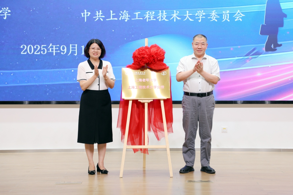 朱晓青与王松华为“上海老年大学上海工程技术大学分校”揭牌