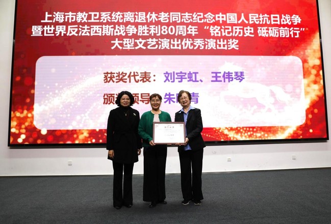 朱晓青为市离退休干部“示范”兴趣组队获奖单位、“泰康杯”上海老年合唱周银奖获奖单位、市教卫系统离退休老同志纪念中国人民抗日战争暨世界反法西斯战争胜利80周年“铭记历史砥砺前行”大型文艺演出优秀演出奖获奖单位颁奖,并向获奖单位表示祝贺。